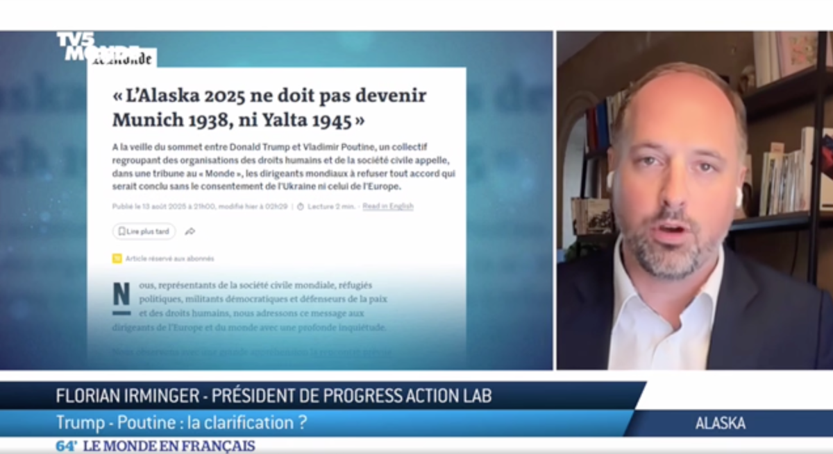 Our President, Florian Irminger, on 15 August 2025, on TV5 Monde, discussing the op-ed we co-published in Le Monde about the Summit in Alaska between Presidents Trump and Putin.